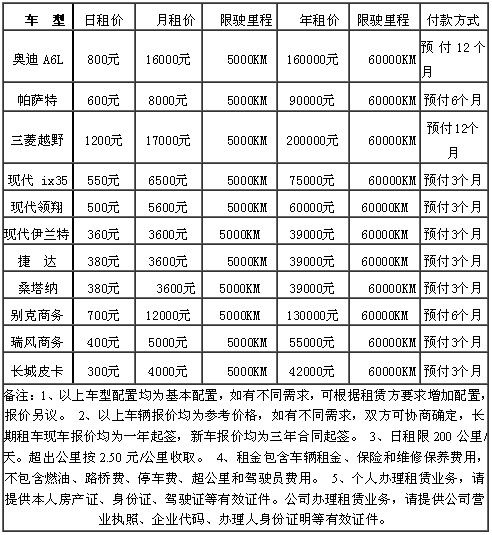 泰安首汽租賃公司租賃車(chē)輛報(bào)價(jià)表
